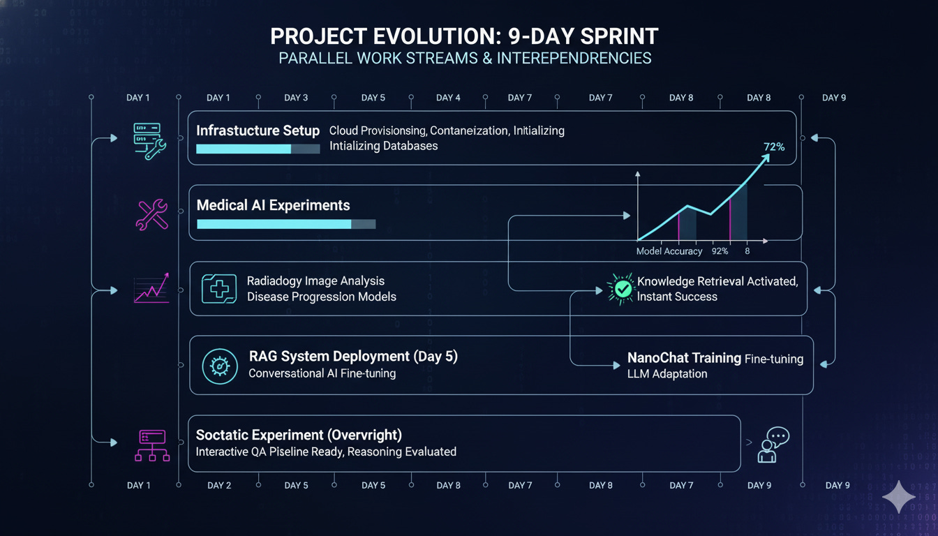 While fine-tuning medical AI models overnight, we were also setting up monitoring dashboards, configuring Docker virtualization, building RAG search platforms, and training language models from scratch. Each system fed into the next. Each experiment taught us something that improved the infrastructure.