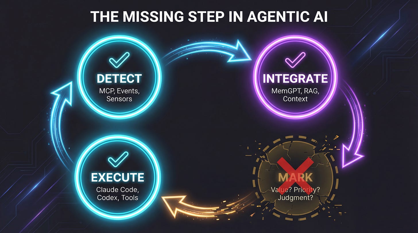 Every agentic framework in production today goes directly from “here’s what I know” to “here’s what I’ll do.” The step that asks “does this matter, and how much, and compared to what?” is either missing or hardcoded by a human.
