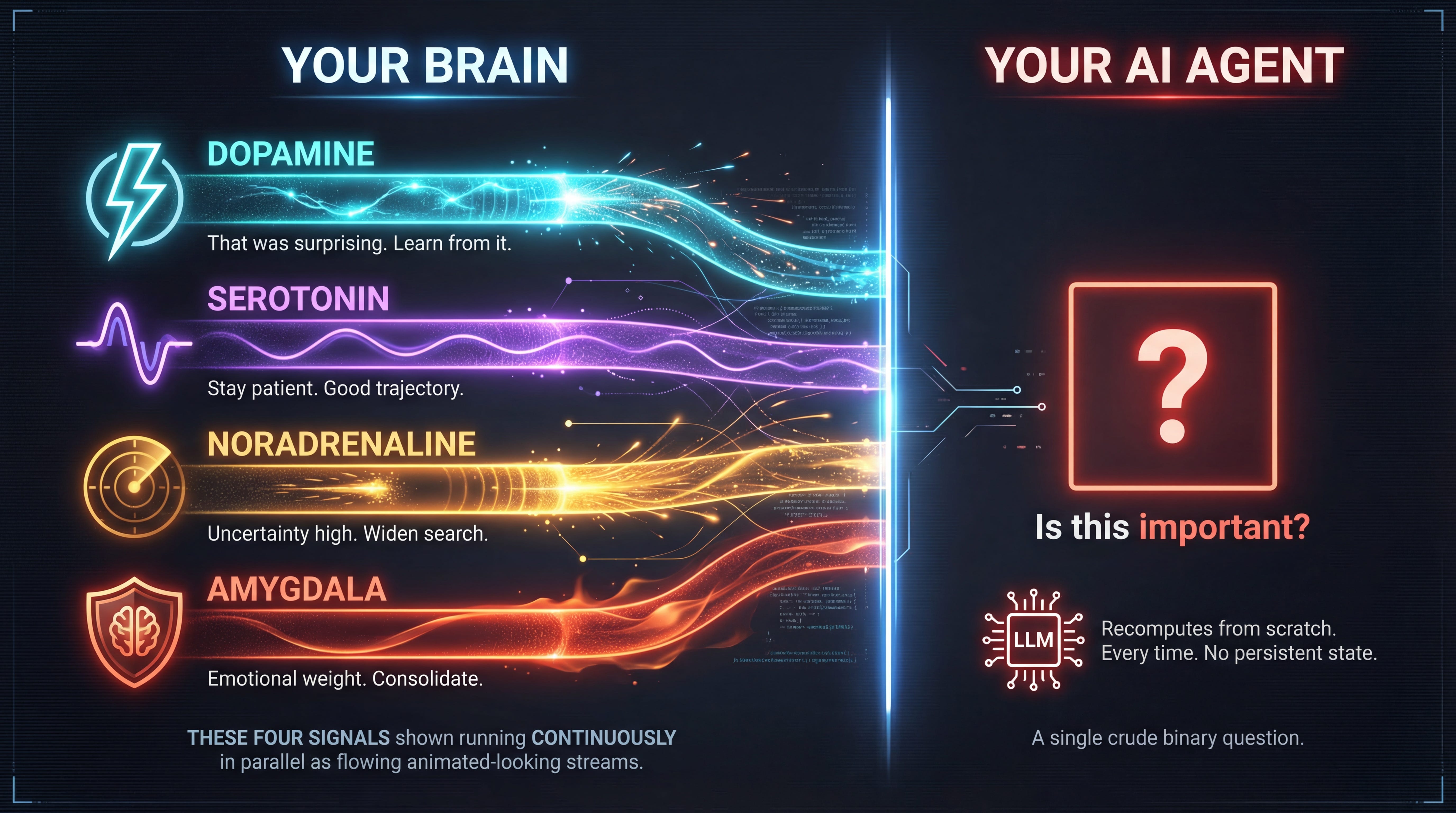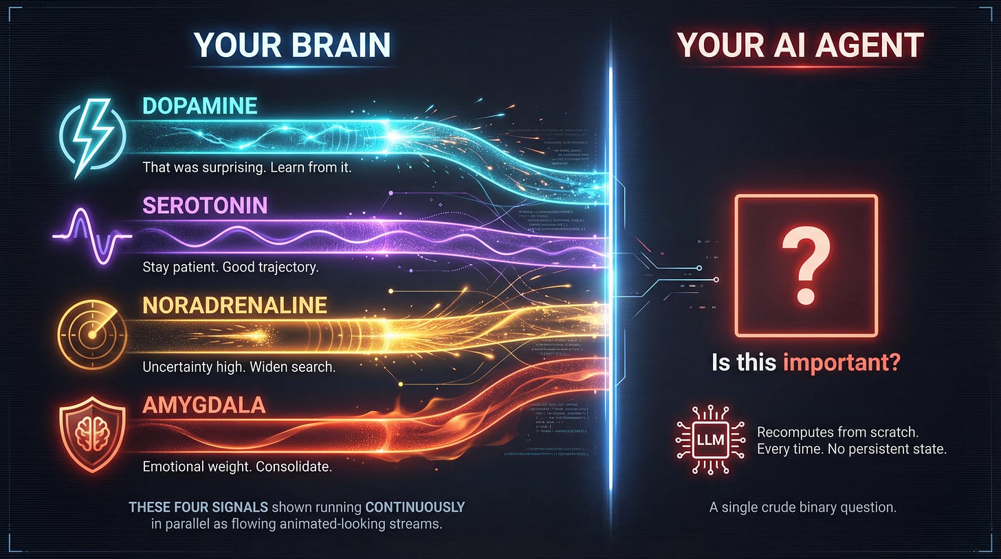 Your brain doesn’t ask “is this important?” after the fact. It runs a continuous, multi-dimensional value signal alongside every computation. Dopamine says “that was surprising, learn from it.” Serotonin says “stay patient, you’re on a good trajectory.” Noradrenaline says “uncertainty is high, widen your search.” The amygdala says “this has emotional weight, consolidate it.” These signals aren’t bolted onto cognition. They shape it in real time.