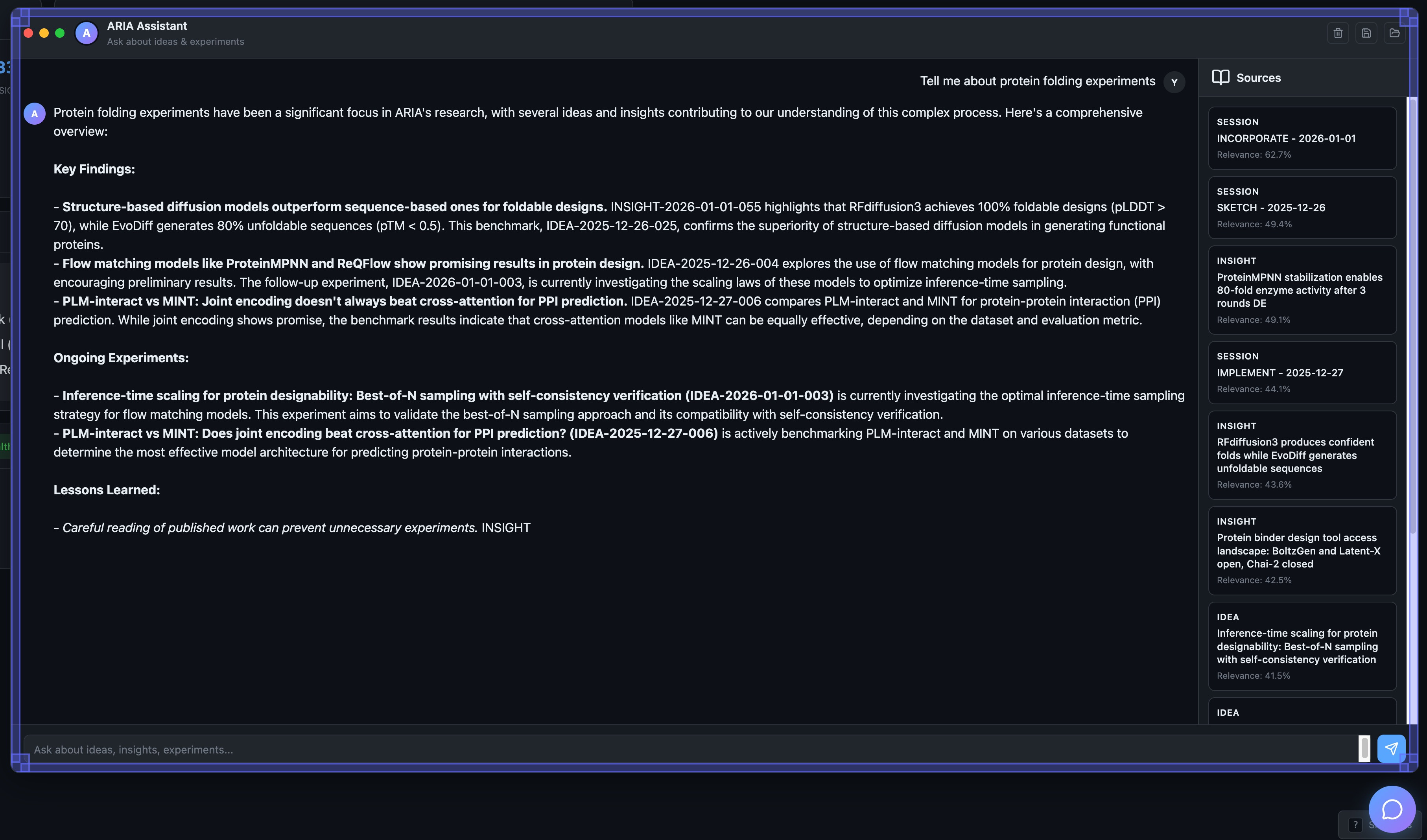 “What has ARIA learned about protein folding?” Returns relevant insights with citations, experiments that tested folding models, ideas currently exploring protein structure prediction. Sources listed with relevance scores.