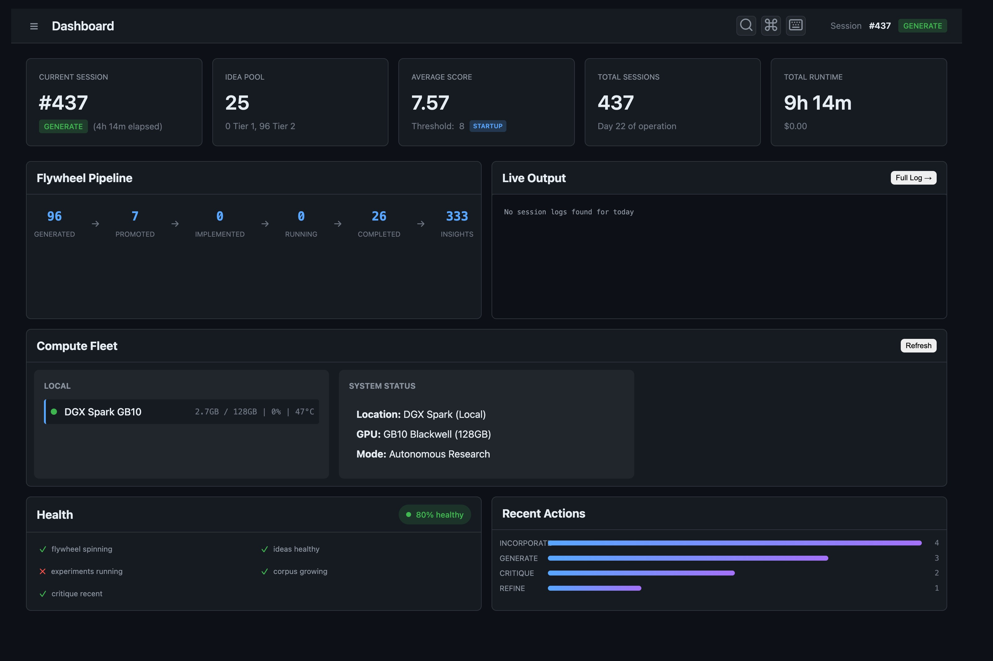 The Command page gives you the system’s state at a glance. Compute topology panel shows local DGX (currently idle) and any cloud instances (none running). The flywheel visualization shows ideas moving through each stage.