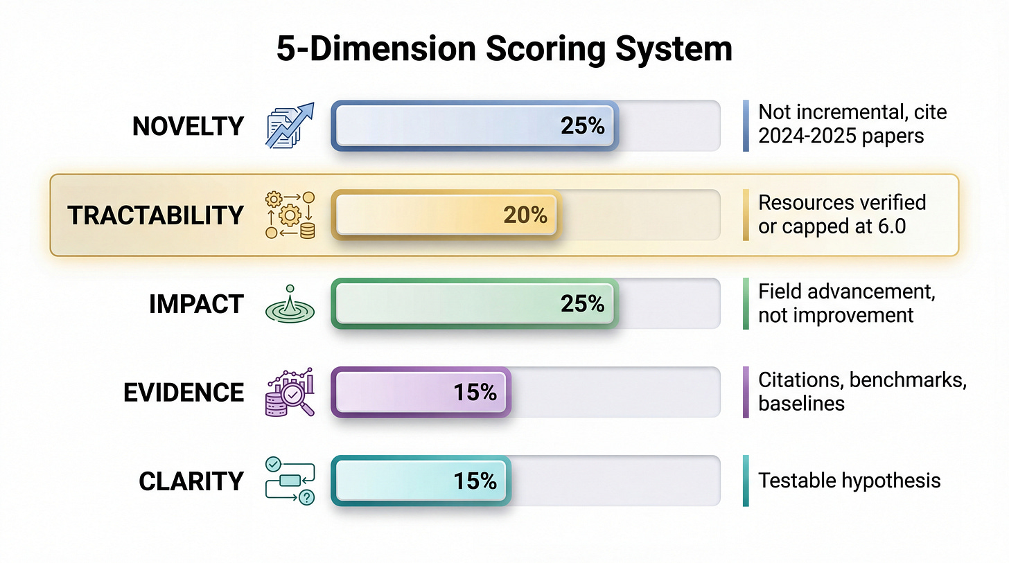 Resource verification prevents phantom work. Before scoring tractability above 6.0, the system checks. If the model doesn’t exist or requires credentials we don’t have, tractability gets capped. This caught multiple ideas that would have wasted days: