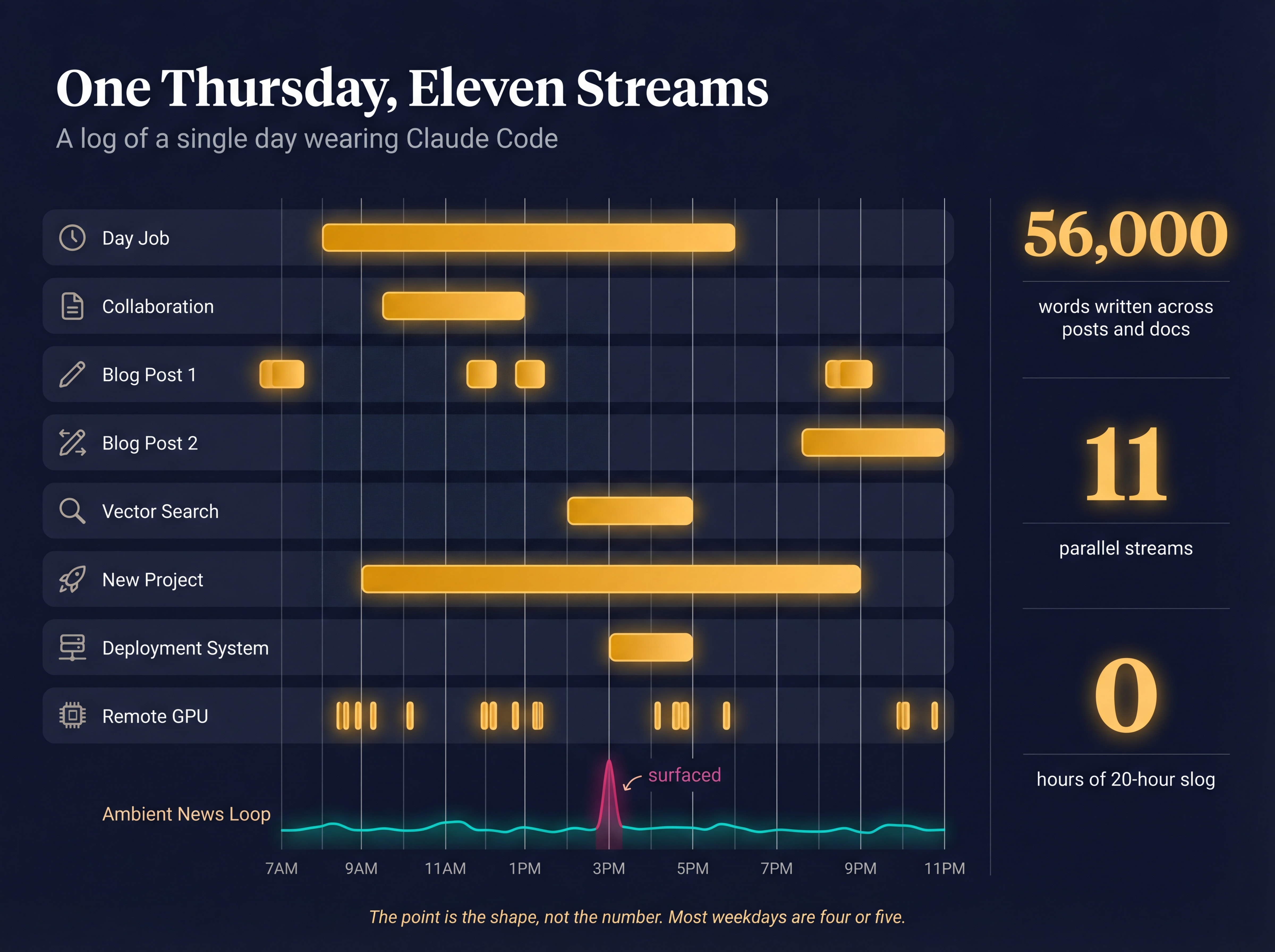 Eleven streams is the high side of a normal day. Most weekdays are four or five. The point is the shape, not the number. Infrastructure that compounds, doing the carry I used to do alone.
