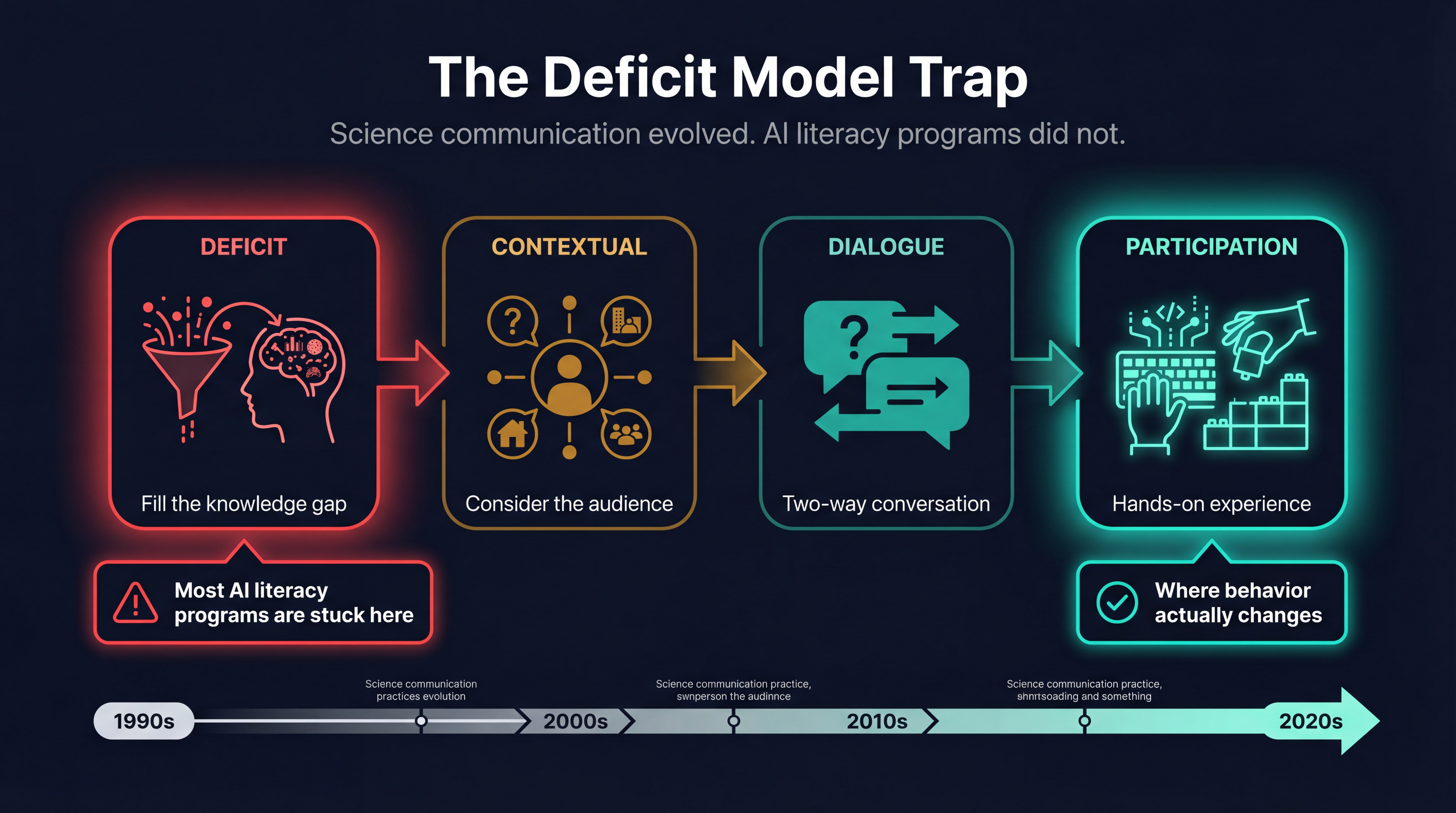Nearly every corporate AI literacy program reproduces this discredited Stage 1 approach. “Demystifying AI for executives” workshops. Internal newsletters explaining what an LLM is. Lunch-and-learns with the data science team. All deficit model. All built on a paradigm that science communicators abandoned in the 1990s.