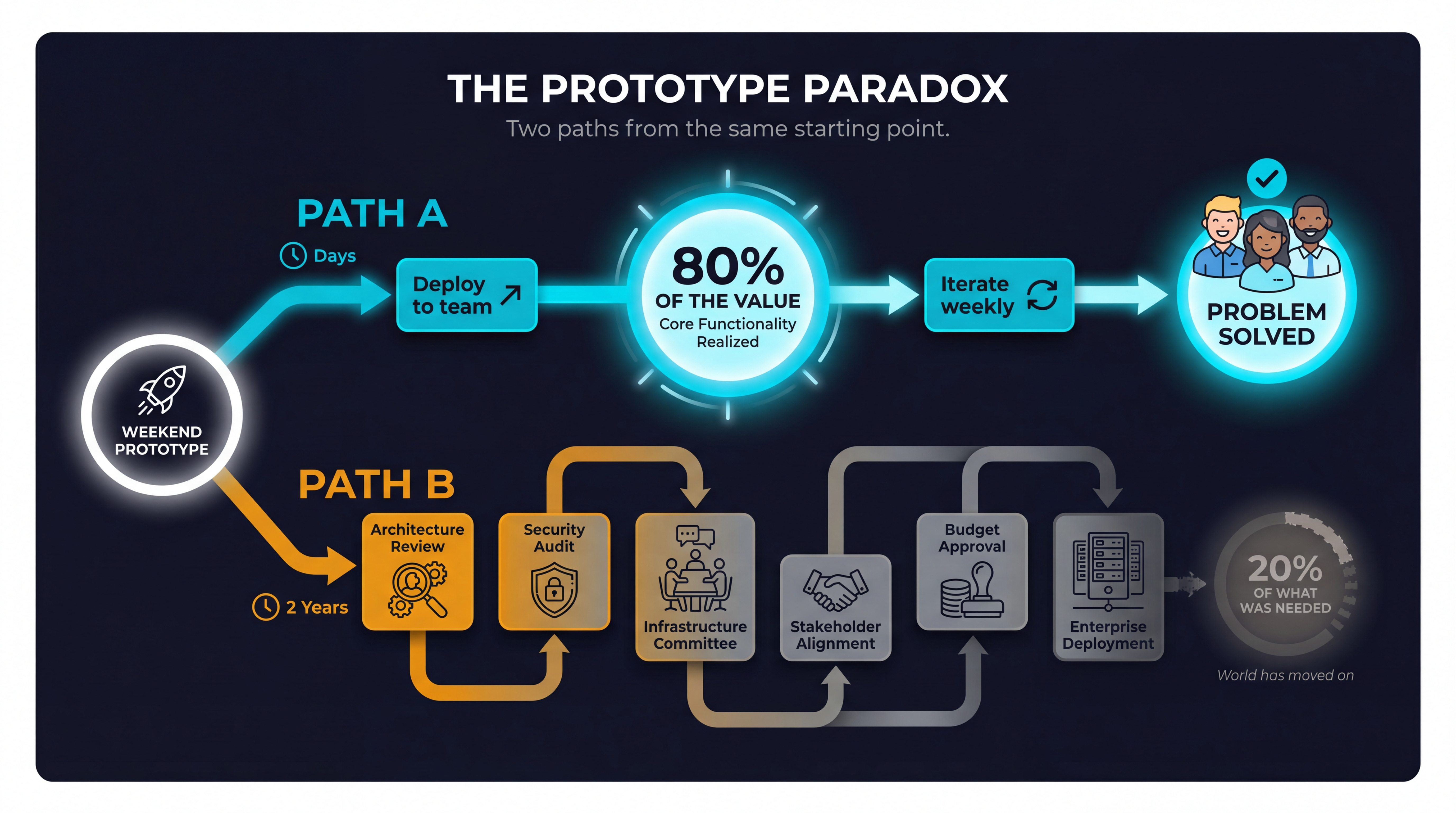 The physics of value creation have changed. A prototype built over a weekend can deliver genuine, measurable value to a small group of people with minimal effort. The organizational machinery designed to turn that prototype into a “production system” takes months or years of architecture reviews, security audits, infrastructure committees, and stakeholder alignment. By the time it ships, the problem has evolved, the technology has moved on, and what gets delivered is 20% of what 80% of the people actually needed.