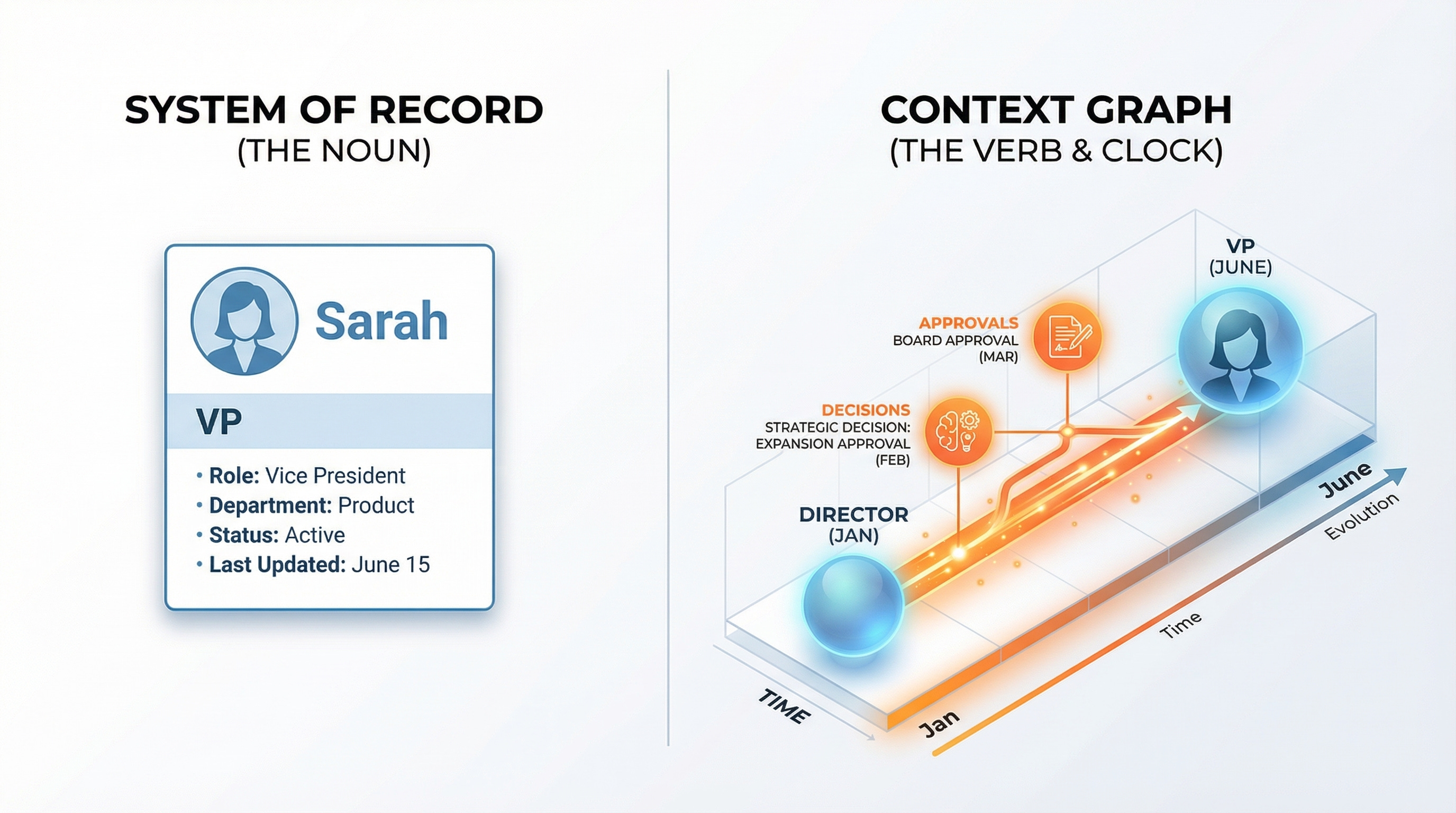 Your CRM knows Sarah is a VP. It doesn’t know she was a Director until June, and that the pricing exception approved in May happened before she had authority, which is why Finance flagged it as suspicious. That temporal gap turns into an agent failure. The system sees the current state, applies current rules, and misses the context that explains the exception.
