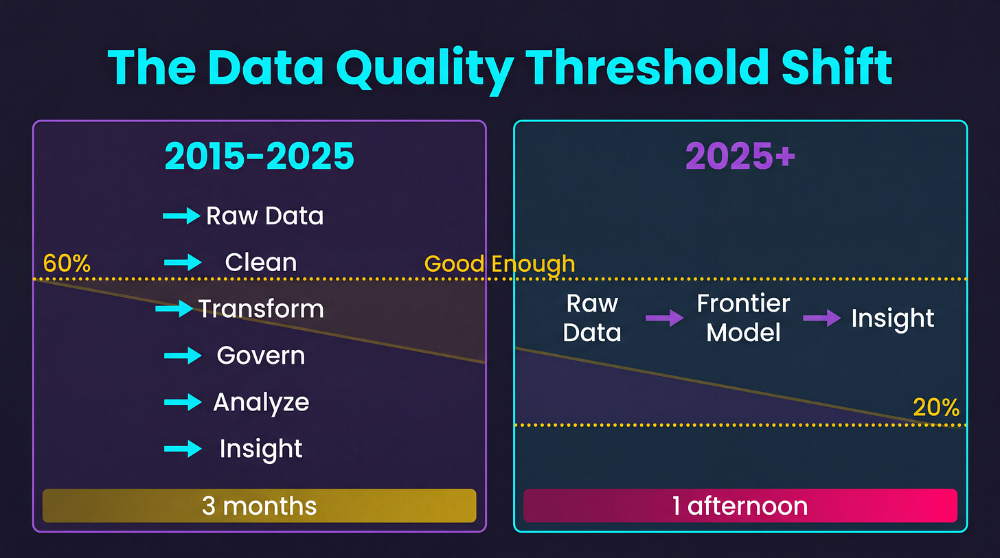 The organizations that navigate this well will be the ones that can hold two ideas simultaneously: data quality still matters for some things, and data quality is becoming irrelevant for others. The ones that struggle will be the ones that can’t let go of a decade of institutional commitment to a paradigm that’s shifting under their feet.
