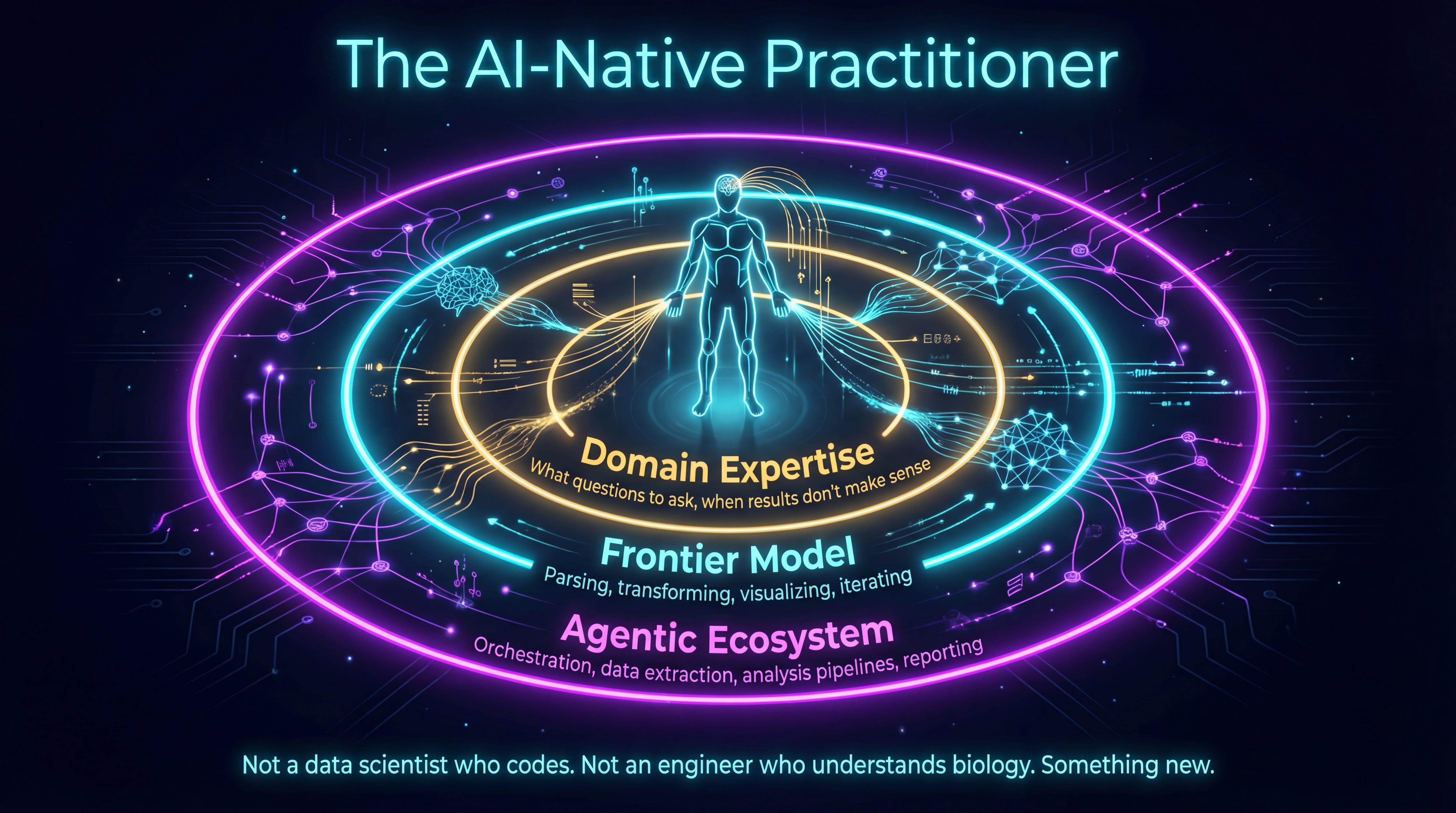 Couple that domain expert with an agentic ecosystem, orchestration tools that let them string together data extraction, analysis, and reporting into flows they control, and you’ve got something genuinely new. Not a data scientist who codes. Not an engineer who understands biology. An AI-native practitioner who uses frontier models the way a previous generation used spreadsheets: as a thinking tool, not a product someone else built for them.