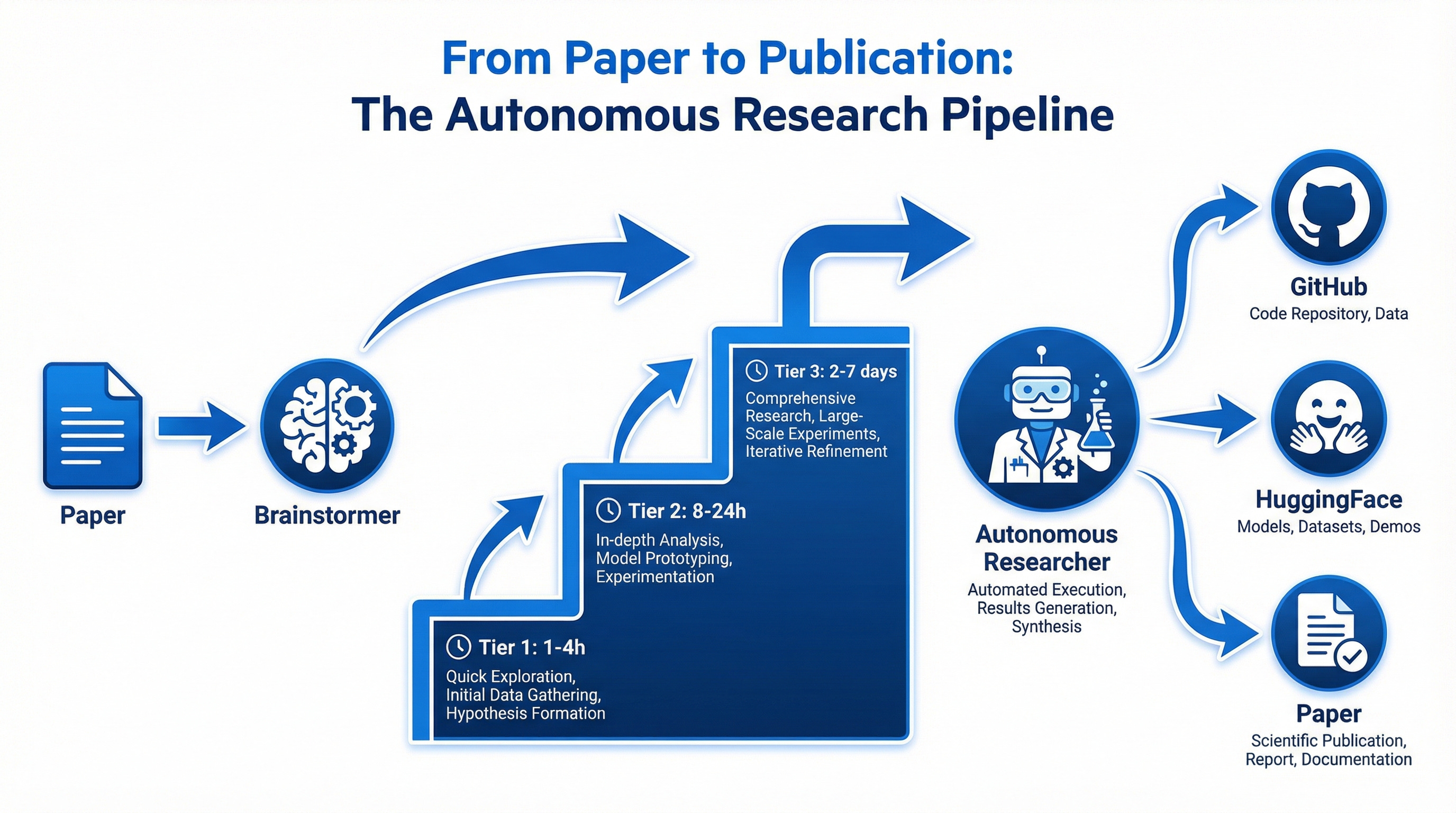 Gemini Image Prompt: “Flowchart infographic showing research pipeline: Paper (document icon) → Brainstormer (brain with gears) → Three tiers shown as ascending steps (Tier 1: 1-4h, Tier 2: 8-24h, Tier 3: 2-7 days) → Autonomous Researcher (robot scientist icon) → Outputs (GitHub logo, HuggingFace logo, paper icon). Use blue and white color scheme. Clean lines, modern design. Title: ‘From Paper to Publication: The Autonomous Research Pipeline’”