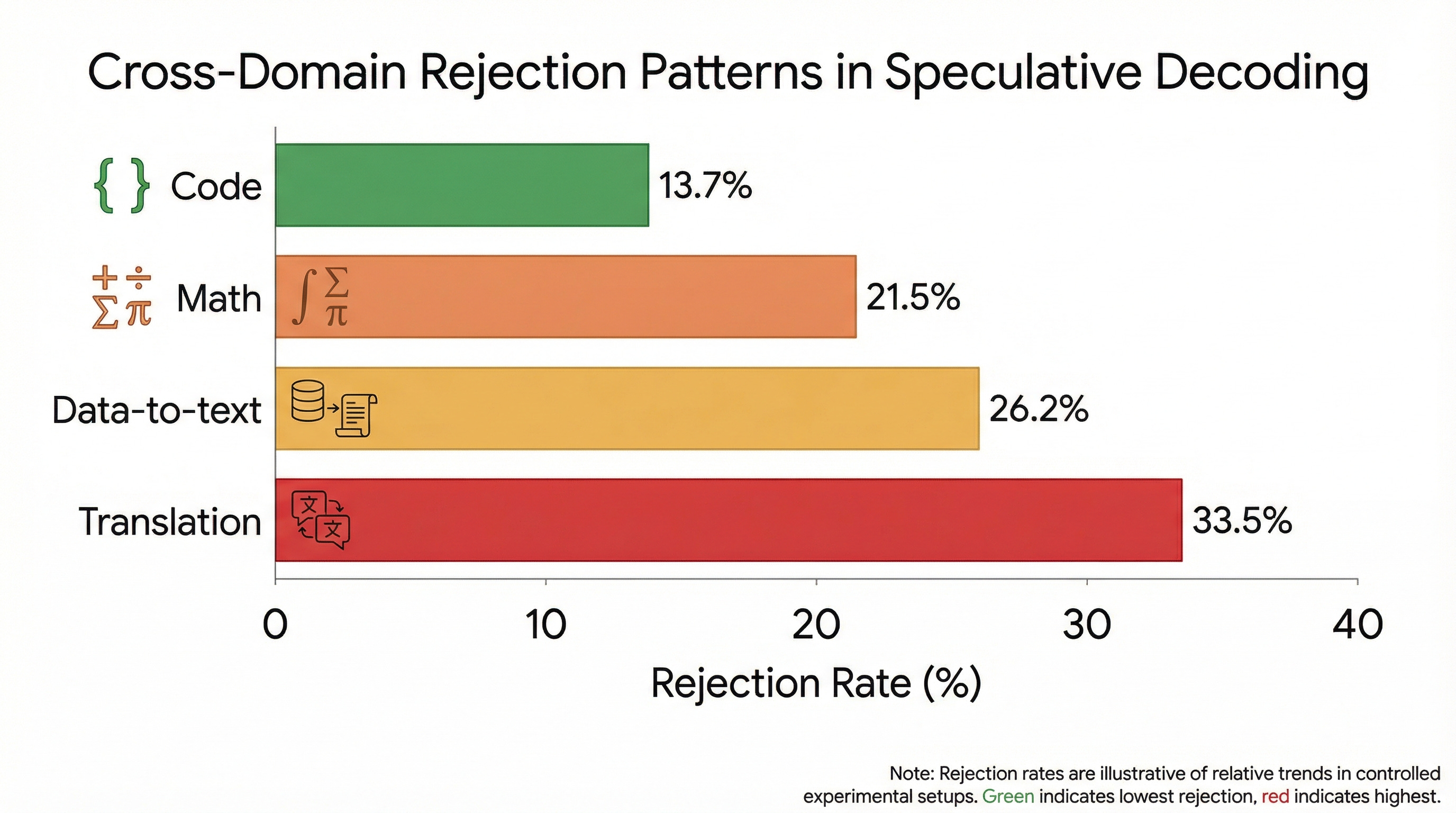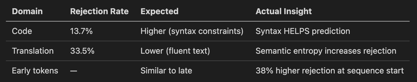The conventional wisdom was wrong. Code generation, with its strict syntax, should be harder to predict. Instead, syntax constraints make draft tokens MORE predictable. Translation, which seems fluent and natural, has the highest rejection rate because semantic choices are less constrained.