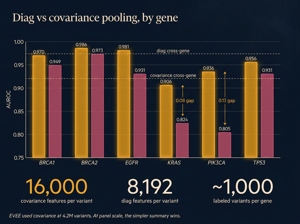 Covariance pooling. EVEE’s original paper uses covariance pooling, a more sophisticated way of summarizing the model’s per-position activations (it tracks how features vary together, not just individually). I reimplemented it faithfully, ran it, and it lost to plain diag pooling on every single gene. Cross-gene covariance 0.920 against diag 0.974. On KRAS and PIK3CA the gap was 0.08 to 0.13 AUROC. Why? The fancier summary produces roughly 16,000 features per variant, and at roughly 1,000 variants per gene, the probe has too many knobs and not enough data to constrain them. EVEE trained on 4.2 million variants. At that scale, the parameter count gets earned. On a six-gene panel, it doesn’t.