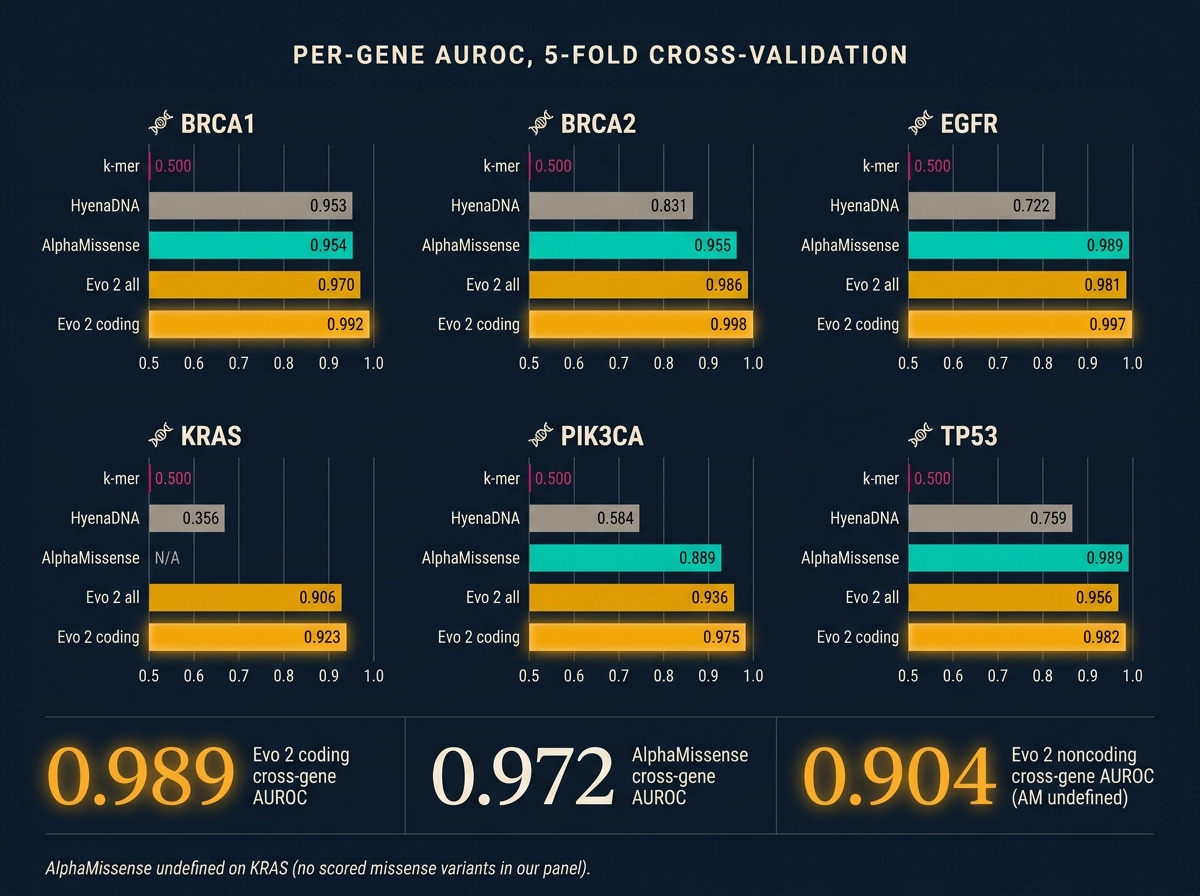 Noncoding is where the real coverage win lives. AlphaMissense is undefined on noncoding. Evo 2 gets 0.904. That is a modest-but-real 1,072-variant result with heavy class imbalance (most labeled noncoding are benign, only around 170 pathogenic across the panel). TP53 has enough labeled noncoding pathogenic for a per-gene fit and lands at 0.905. The other five genes ride the cross-gene probe. The result holds: these are variants AlphaMissense produces no score for, that Evo 2 produces a usable one for.