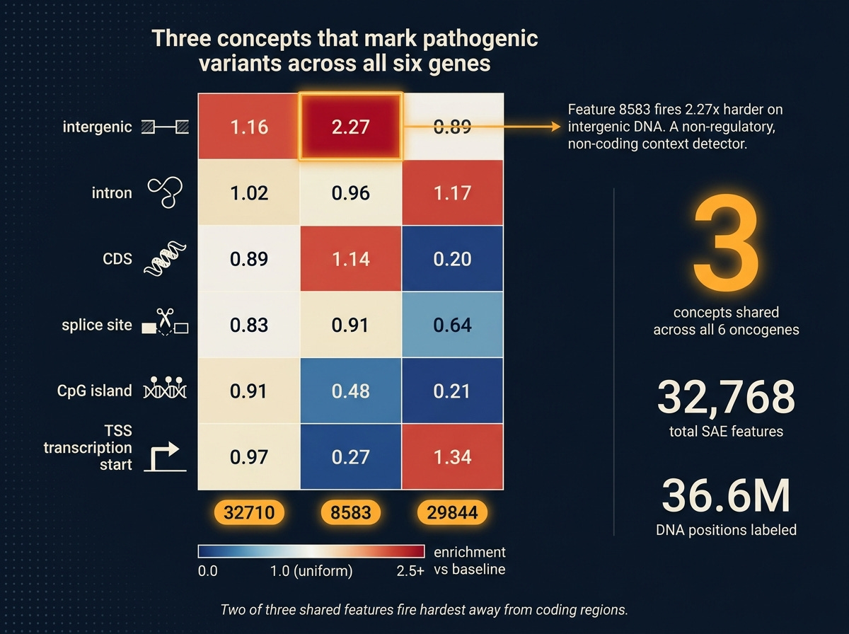Three concepts (features 32710, 8583, 29844) land in the top-10 for every one of the six genes. Not different features for different genes, the same three across all six. That’s a candidate set of general disruption detectors: SAE concepts that light up whenever a pathogenic variant perturbs its context in a consistent direction, regardless of which oncogene is involved.