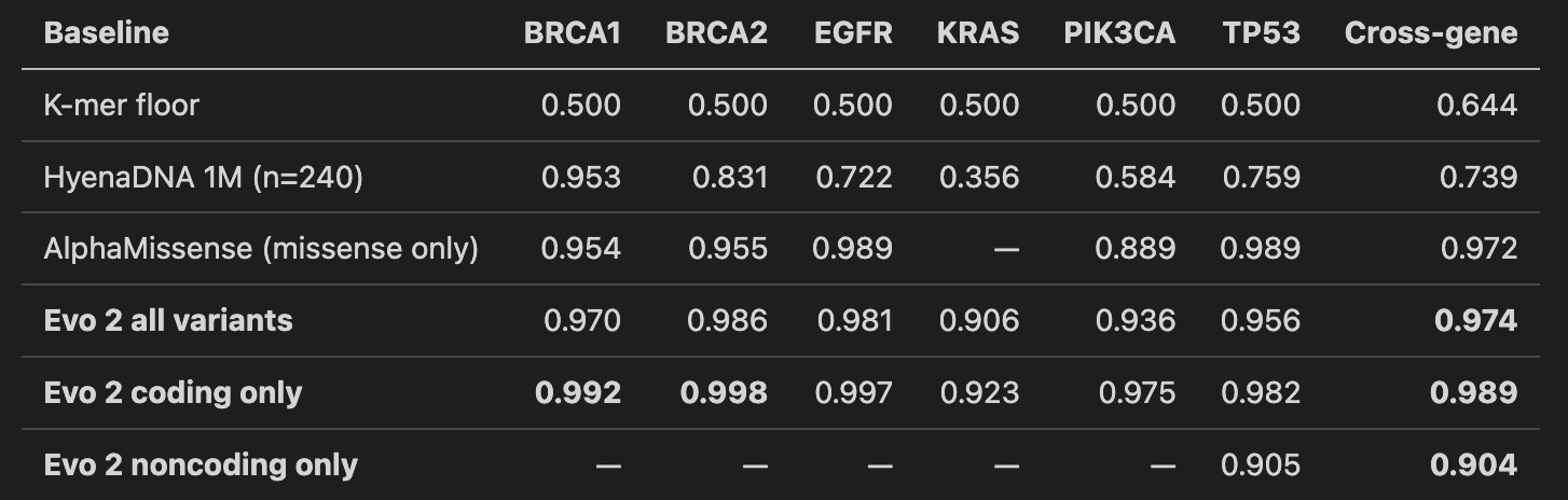 Evo 2 beats the specialist on coding. Cross-gene 0.989 against AlphaMissense’s 0.972. Gene by gene, Evo 2 wins everywhere it plays. BRCA1 coding at 0.992 is stronger than the 0.94 Evo 2’s own paper reports on full-ClinVar training. I read that not as my reimplementation being better than Arc Institute’s, but as a focused oncogene panel being an easier subset of the full variant distribution. The panel matters.