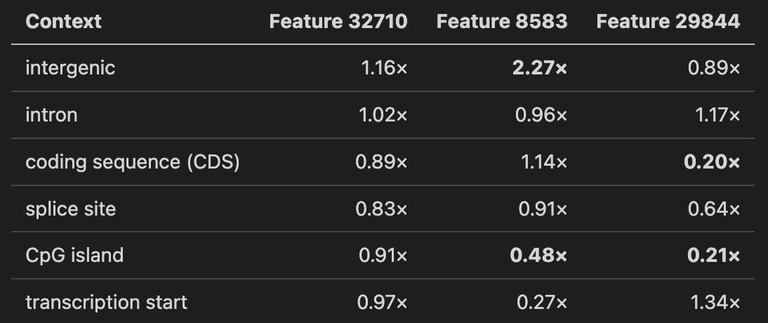 Feature 8583 is an intergenic-context detector. Fires 2.27 times harder on intergenic positions than average, less than half as hard on CpG islands and transcription start sites. A “non-regulatory, non-coding context” signature. When it responds to a pathogenic variant, the model is reacting to disruption of how the sequence looks away from canonical regulatory anchors.