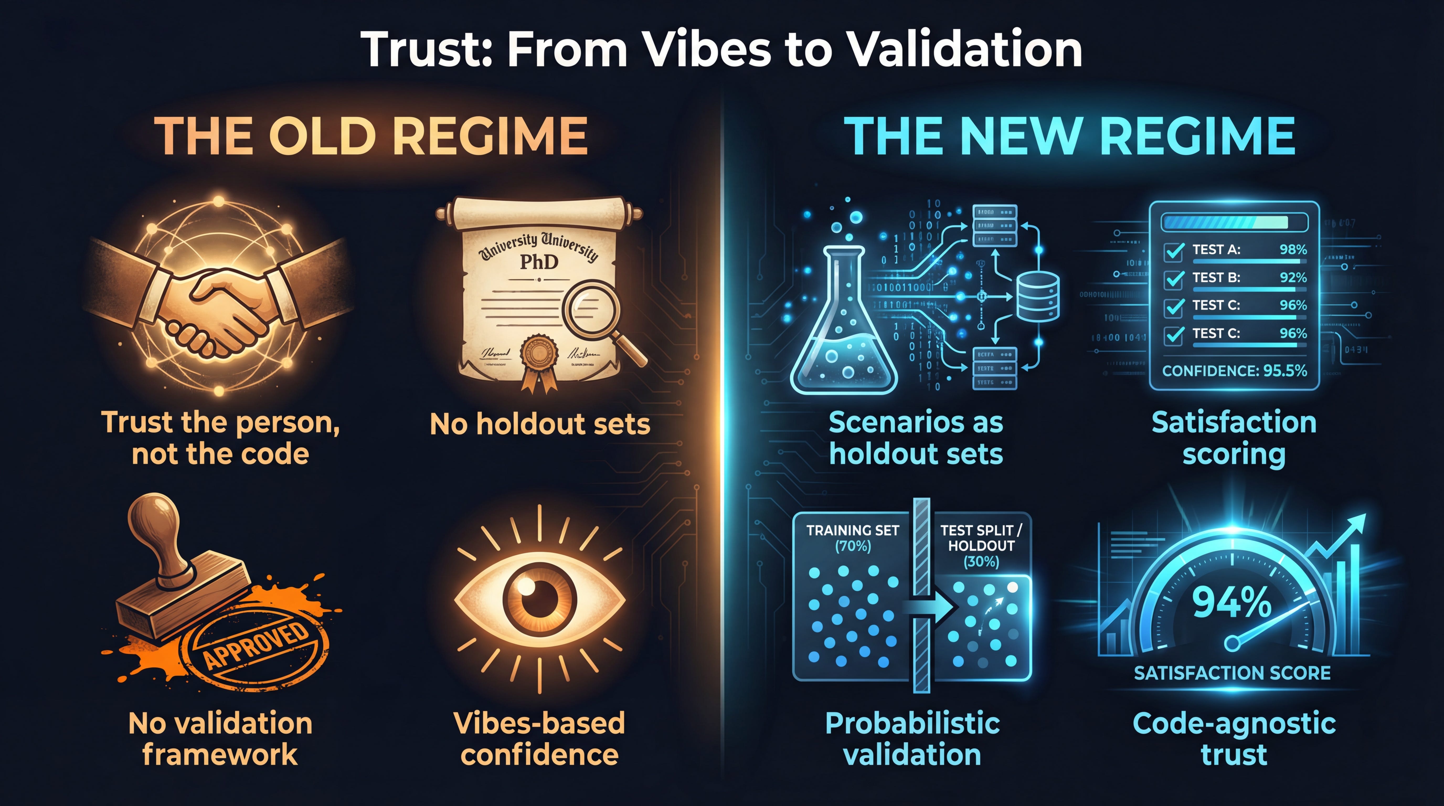 The new regime is trust as an engineering discipline. StrongDM’s core insight: if you can’t review the code (because no human wrote it), you’re forced to build real validation. They replaced traditional tests with scenarios, end-to-end user stories stored outside the codebase, invisible to the coding agents, functioning exactly like holdout sets in machine learning. Validated not by assert statements but by an LLM-as-judge measuring satisfaction: across all observed trajectories through all scenarios, what fraction likely satisfy the user?
