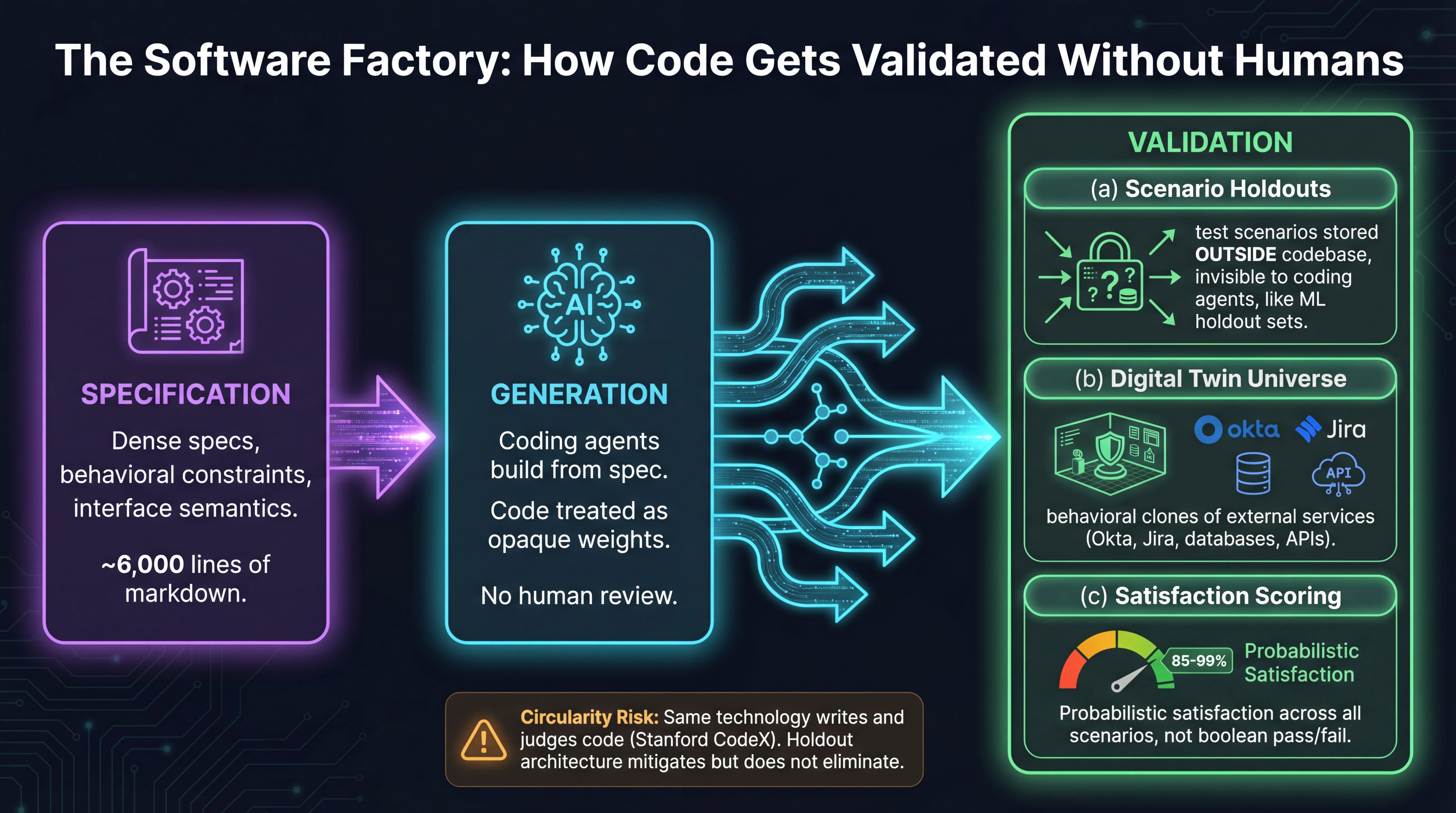 Justin McCarthy and a three-person team at StrongDM are living at Level 5. Their charter has two rules: code must not be written by humans, and code must not be reviewed by humans. They treat source code the way ML engineers treat model weights: opaque artifacts whose correctness is inferred exclusively from externally observable behavior. They validate with scenarios (not tests), measure satisfaction (not pass/fail), and run everything against a Digital Twin Universe of behavioral clones of Okta, Jira, Google Docs, and half a dozen other SaaS platforms.