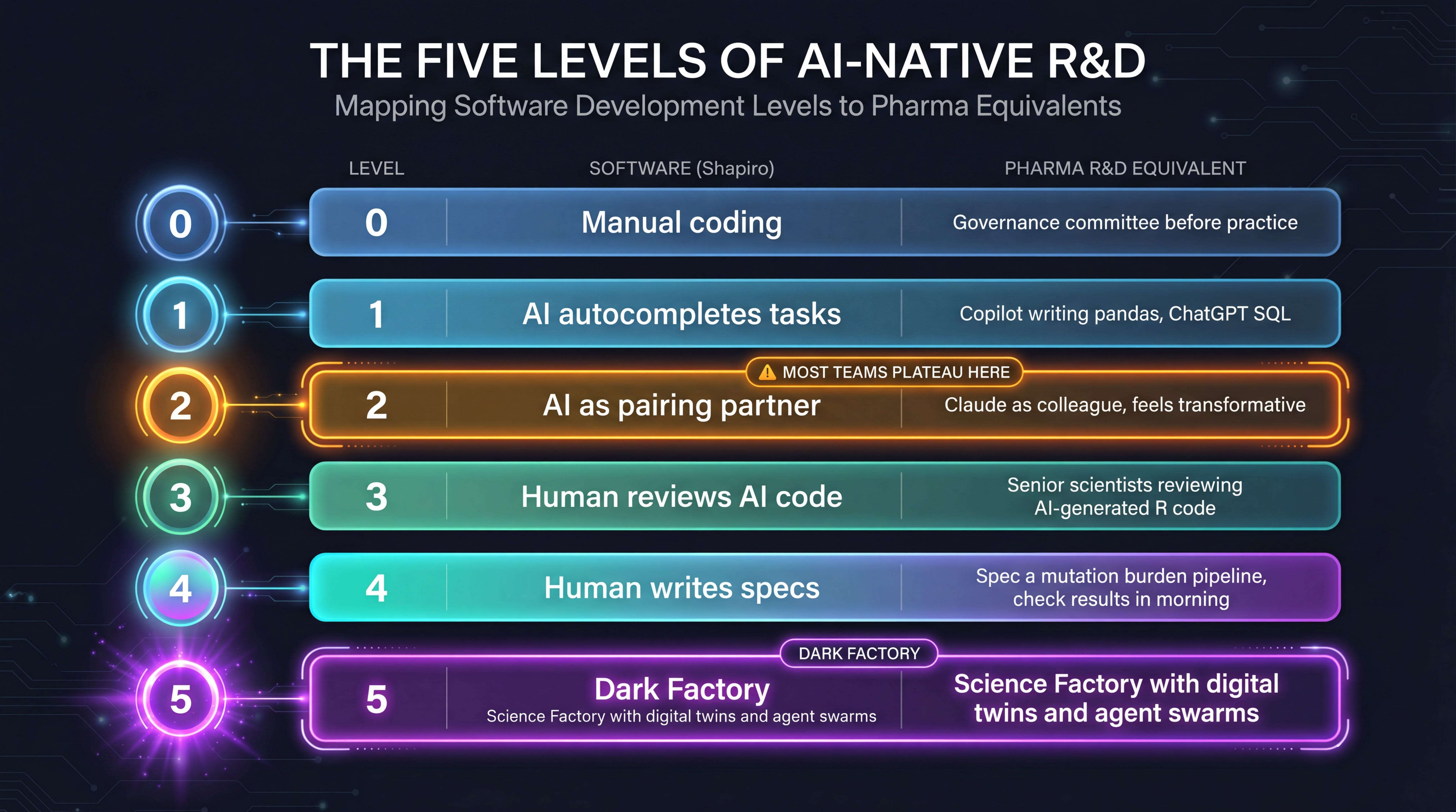 Level 4 is the Spec Writer. You stop writing code. You stop reviewing code. You write specifications. Describe what a tumor mutation burden pipeline should do across known cohorts. Define expected outputs for BRCA1/2 queries against curated reference datasets. Define the edge cases. Walk away. Run it overnight. Check satisfaction scores in the morning. In pharma terms, one domain expert paired with an agent harness starts replacing a three-person development team for internal analytical tools. Not because the people weren’t good, but because the bottleneck was never the typing.